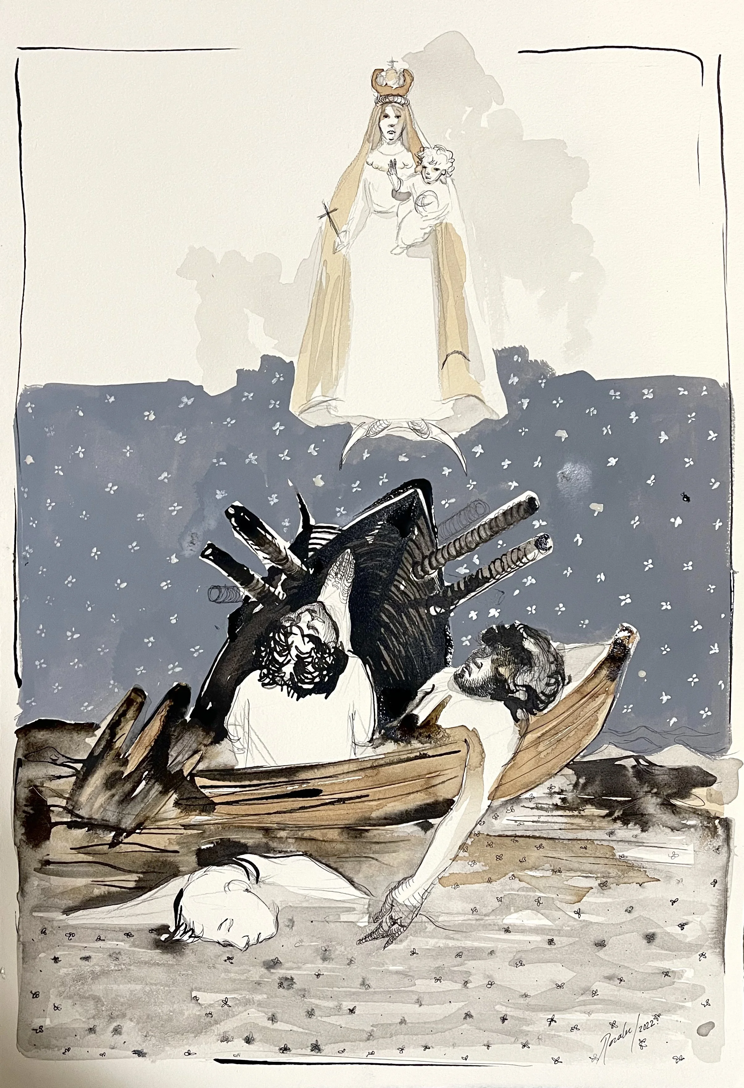 " Denounce to heaven." Ink, cuban coffee and acrylic paint on cardboard. 11 in x 15 in. 2022. Miami, Florida.